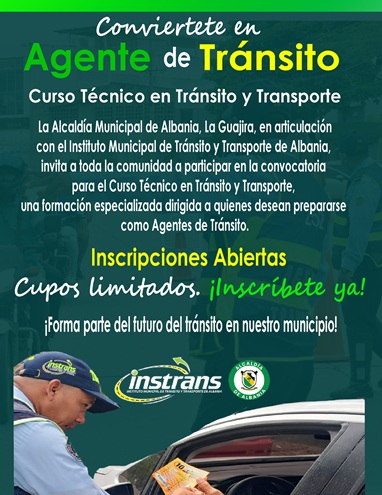 La Alcaldía Municipal de Albania, La Guajira, en articulación con el Instituto Municipal de Tránsito y Transporte de Albania, invita a toda la comunidad a participar en la convocatoria para el Curso Técnico en Tránsito y Transporte, una formación especializada dirigida a quienes desean prepararse como Agentes de Tránsito.